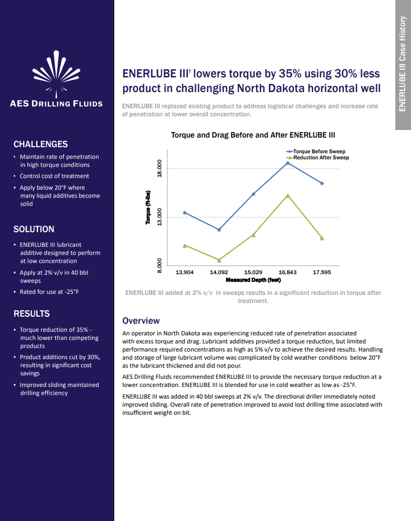 Torque and drag limit rate of penetration and compromise directional control. From our signature ENERLUBE lubricant to our latest options, BRINEX or ENERLUBE LITE, we offer high performance, proven solutions to minimize torque and rag.